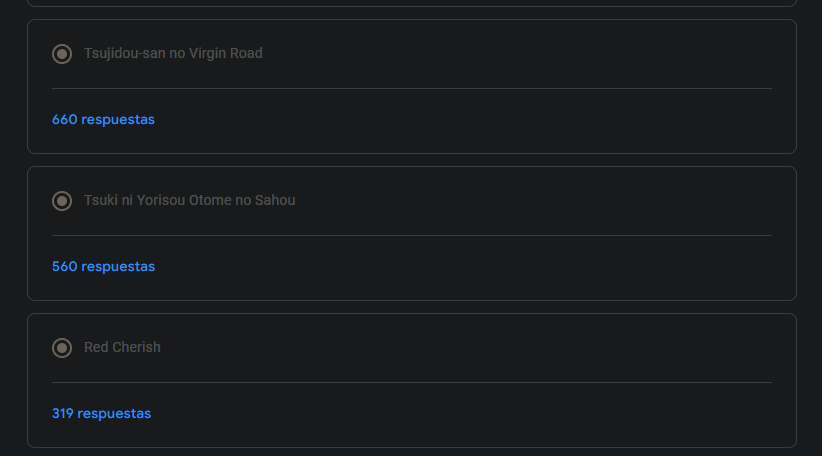 Any other poll I would have voted for virgin road, which I am extremely I will be able to read, but I have to admit that I was really hoping Tsuki ni Yorisou Otome no Sahou would win. Well, the result are what they are, and I am looking foreword to reading virgin road, so thank you for all your hard work, Bee (and everyone else in daybreak translations)! I really appreciate all the hard work!